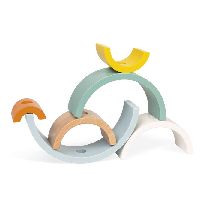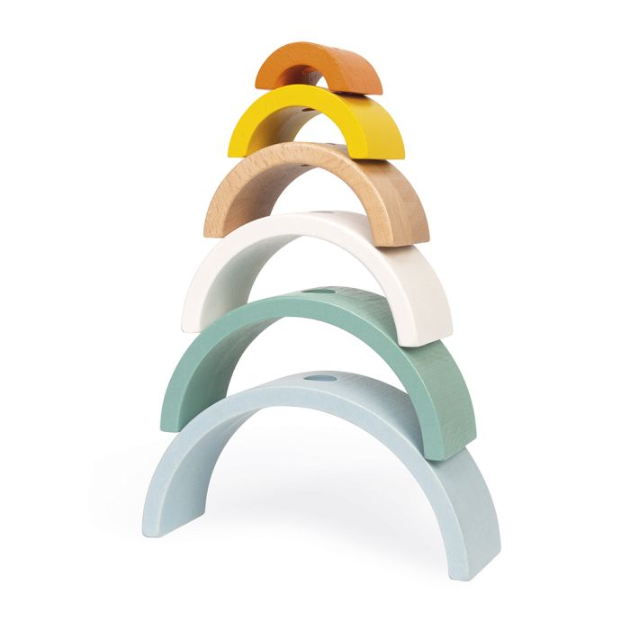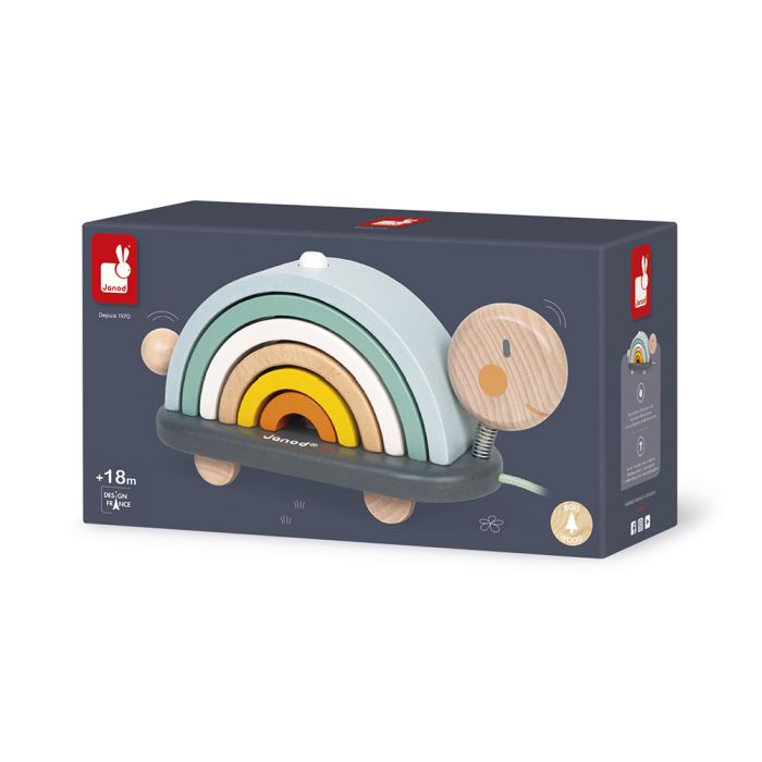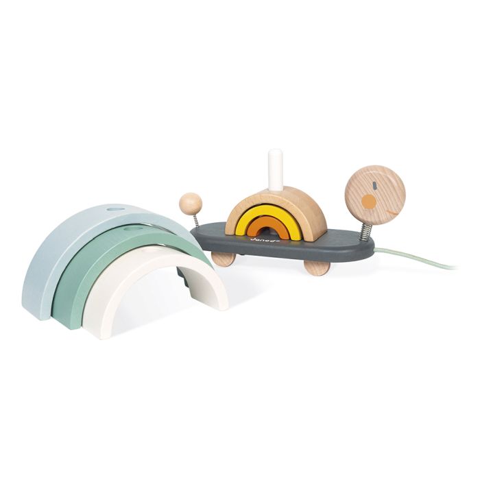 Una bonita tortuga para pasear con su caparazón de arco iris compuesto por 6 arcos de círculos de madera. Los arco iris se apilan según se desee para formar un juego de construcción original. Una gama con colores delicados y líneas redondeadas, inspirada en las tendencias actuales para acompañar los primeros aprendizajes de su hijo(a) con toda dulzura.