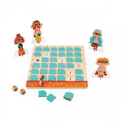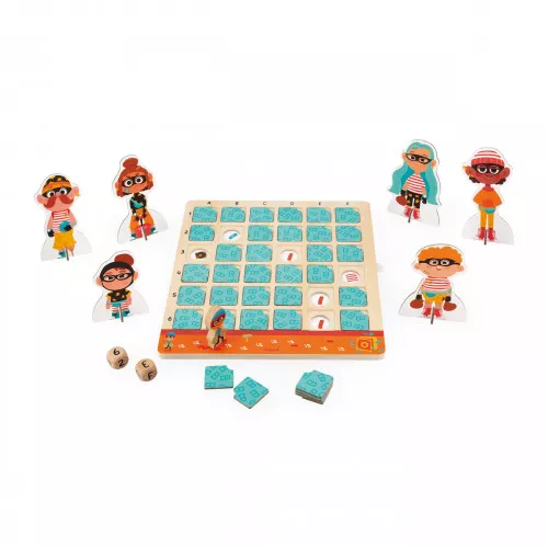 ¡Se necesitan investigadores sagaces para desenmascarar al sospechoso que pretende atracar el banco! ¡En solitario o en grupo (hasta 4 jugadores) hay que encontrar el mayor número de pistas antes de que el malhechor se haga con el botín! Este juego educativo de madera es ideal para divertirse afrontando un reto que obligará a los niños a partir de 5 años a echar mano de su reflexión, capacidad de observación y lógica. Además así aprenderán cómo funciona un tablero de doble entrada. Para conseguir los indicios necesarios, habrá que saber interpretar las tiradas del dado en la fila y la columna correspondientes. Al quitar la carta que se encuentra donde se cruzan esos dos datos, aparecerá una nueva pista. Los seis sospechosos tienen rasgos particulares que, por suerte para nuestra investigación, pueden traicionarles. Pero hay que intentar no caer en un cartucho de dinamita porque entonces el bandido se acercará un poco más a su preciado botín. Bandit Project es ideal para pasar un rato divertido y educativo. Juego hecho de madera y cartón FSC®.
