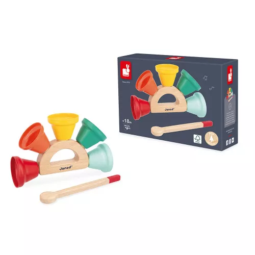 ¡Que suene la alegría! Este es un juguete musical que hará las delicias de los bebés a partir de 18 meses. Compuesto por 5 bonitas campanas de metal, sujetas a un asa de madera, y una baqueta para tocarlas, este juguete de estímulo sonoro es una auténtica delicia. Este juguete de primera infancia fácil de manejar es una divertida introducción a los sonidos. Las campanitas de colores estimulan la agudeza visual, su sonido contribuye al estímulo musical y la manipulación de la baqueta hace trabajar la coordinación de los movimientos. Cada campana produce un sonido diferente, lo que permite a los niños pequeños descubrir los matices del sonido y desarrollar el oído musical. ¡Con este juguete de primera infancia, los bebés pueden dar su propio concierto en casa! Se divertirán haciendo sonar las campanas, reaccionarán a los distintos sonidos y compartirán ratos llenos de música con toda la familia. Este instrumento musical de juguete forma parte de nuestra gama Gioia, una invitación al despertar musical con alegría que sirve a los más pequeños para descubrir el mundo de los sonidos de forma divertida y compartiendo. Juguete de madera con certificado FSC™.