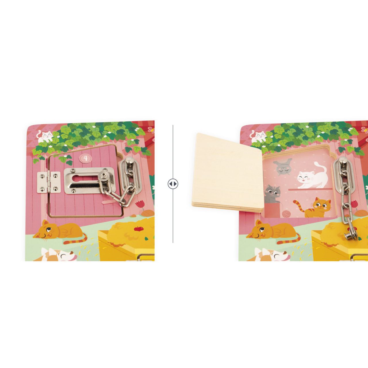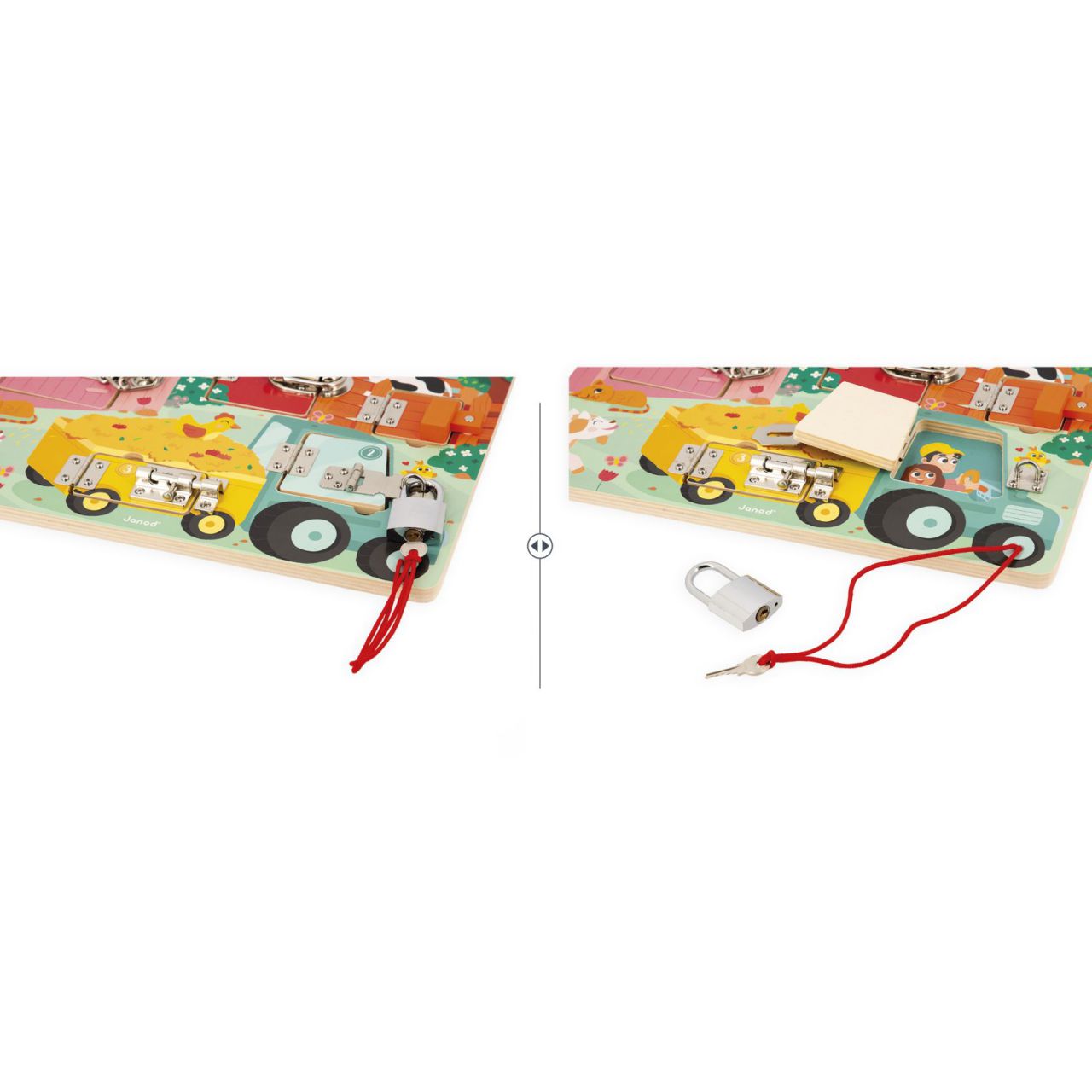 ¡Toc, toc, toc! ¿Quién se esconde detrás de la puerta del granero? Este bonito tablero con cerraduras ilustra la vida cotidiana de los animales de granja y sus crías. Está compuesto por 5 puertas con diferentes sistemas de apertura: una llave (con cerradura), un pestillo, una cadena de seguridad, un cierre de palanca y un cerrojo (cerrojo de botón). Cada puerta está representada por un color y un número diferente. ¡Sorpresa! Este número es igual al número de crías de animales que están escondidas detrás de la puerta. Este bonito juguete de madera permitirá a su hijo desarrollar su destreza mientras aprende los colores, los números y los animales. ¡Es perfecto para pasar momentos lúdicos y divertidos en el corazón de la granja! Juguete de madera FSCTM. Juguete de manipulación para niños a partir de 3 años.